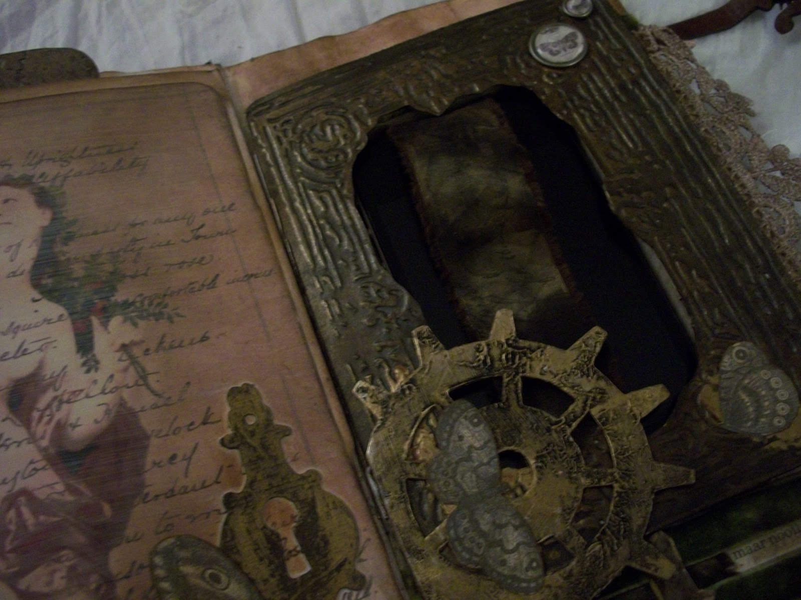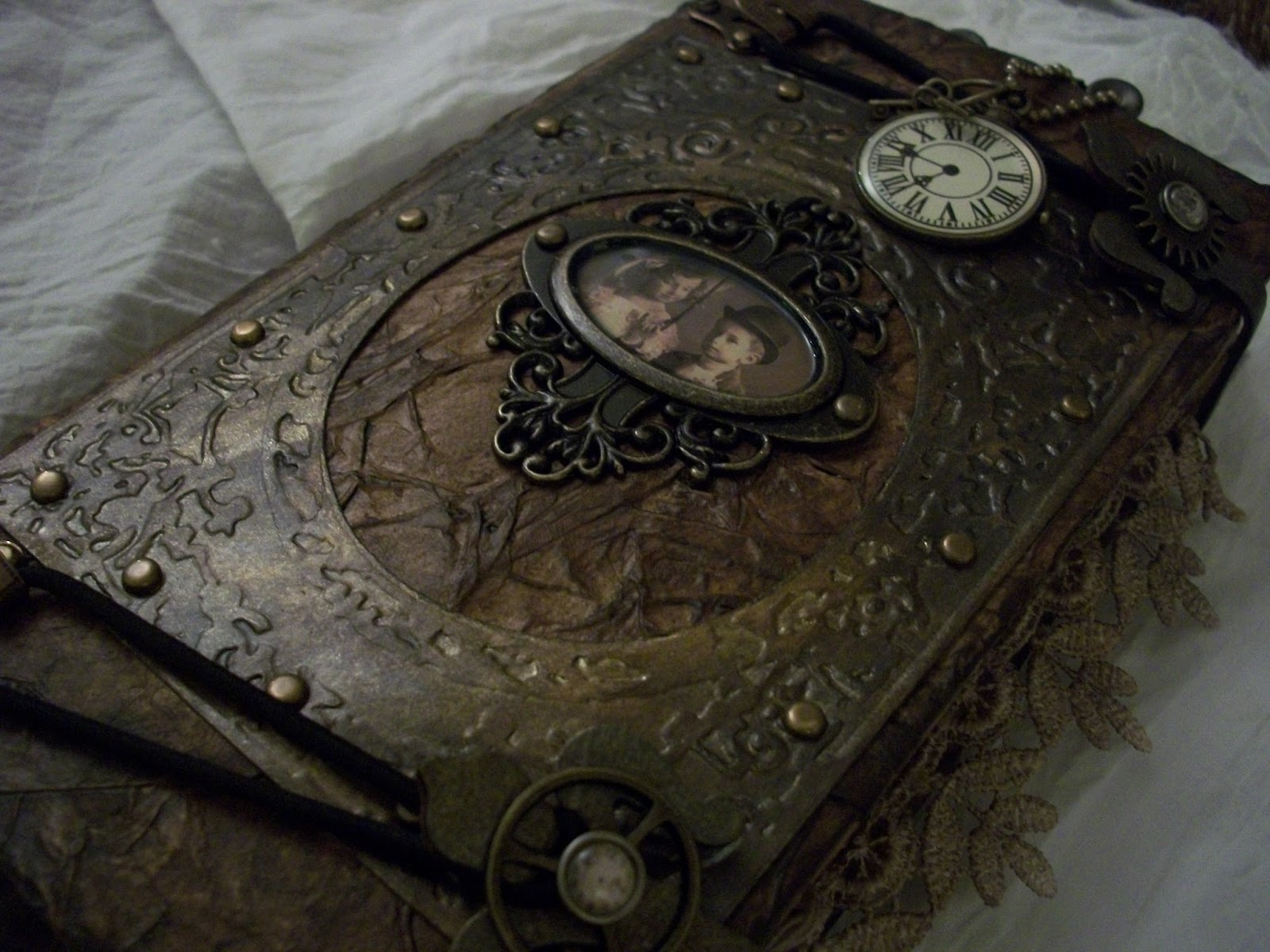 I used brads to attach the plate, the skirt hooks and the frame to the front. And then added some embellishments. The book closes with some elastic bands.