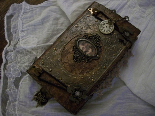 The front plate was made with some cardboard, run through an embossing folder and then treated much the same way as the cover with paint, only for this I used several extra paint colors, some patina blue-green, black and gold. I finshed it with some gold rub ‘n buff, to give it a metalic look.