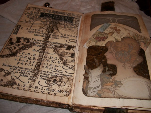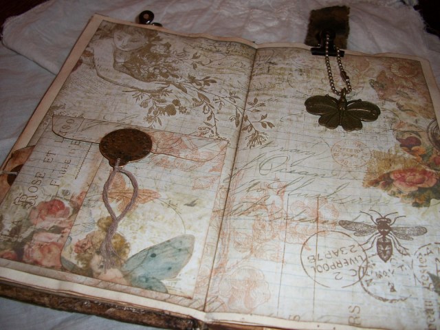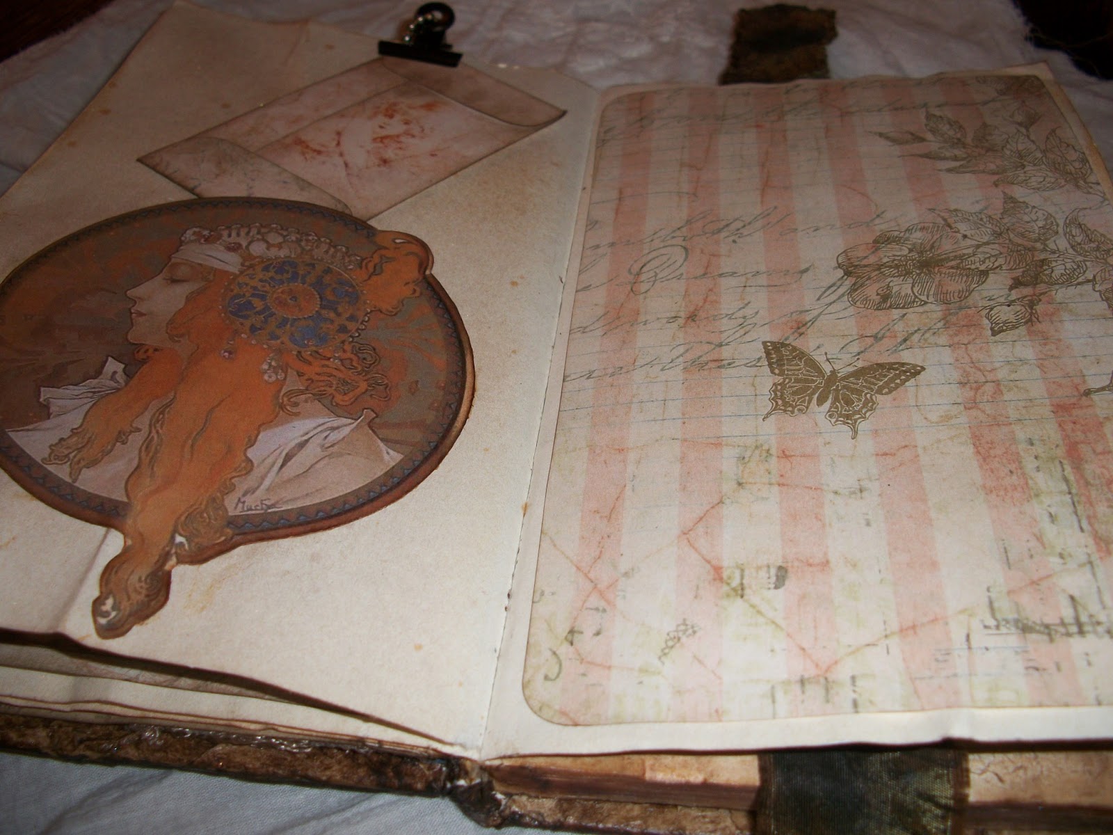 I used the free downloadable set printable papers from Jodie Lee Designs, some freebie printables from Cemerony and some Alfons Mucha pictures. I folded some envelopes from the paper and added some lace, embellishments and clips. The lace and ribbon were grunged up using distress inks and some glimmer mist. I kept the book rather simple, because I will need to be able to carry it with me thoughout the day.