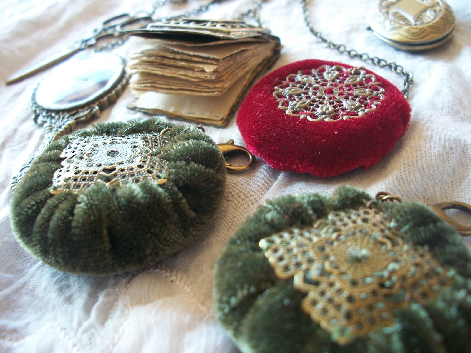 Now this chatelaine also has a tiny pincushion attached to it, as the ladies of the day used to do. Needles were not as cheap as they are today, so they carried them with them. Often on a sewing chatelaine. The pincushion you see here were also made by me. There are two different styles shown here and two different colours, so they can choose wich one to wear to the Elf Fantasy fair.