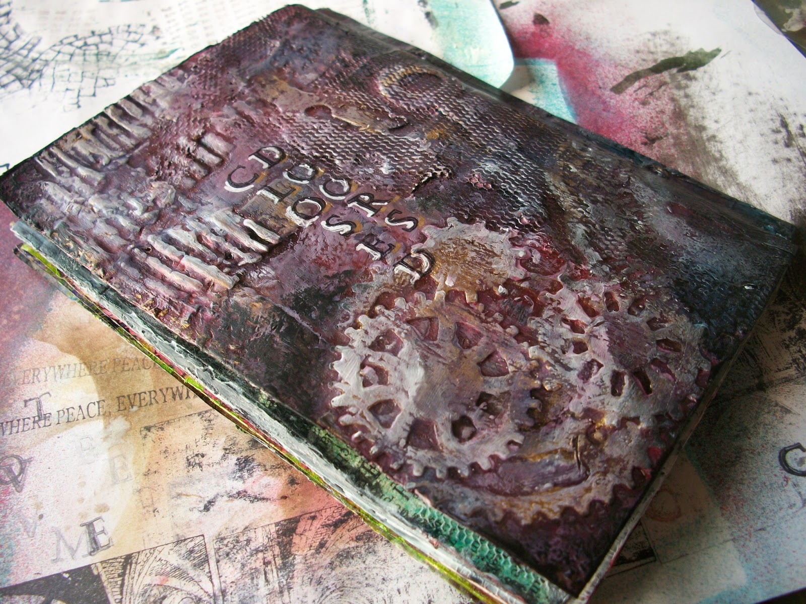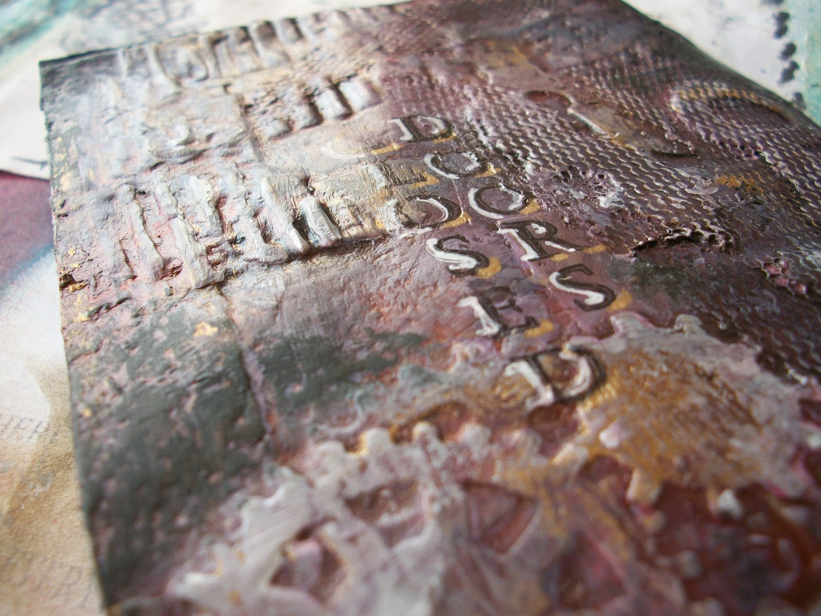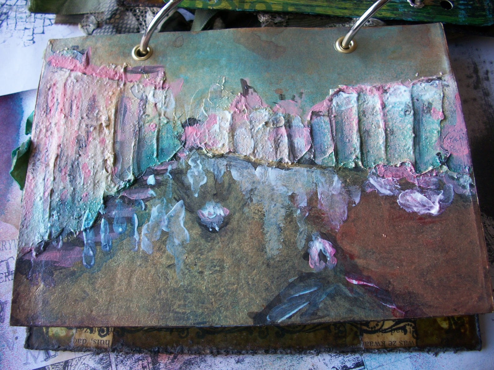 I finished the last few pages of the mini art journal insert. I tried some cool layering and distressing techniques. Unfortunately, I completely forgot to make progress pics. I’ll try and remember that for next time, as I always enjoy watching the process of how one thing (or several things) becomes somthing completely different and unexpected.