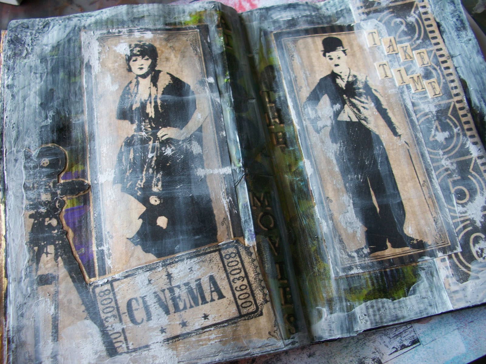For this page I first made a background with acrylic paints and some stencilling. Wich I then allmost completely covered with the cut outs from the papers. I sanded the pictures and then added some white acrylic paint as a white wash. It was really fun, sanding the paper and I love how it makes the pictures look.
