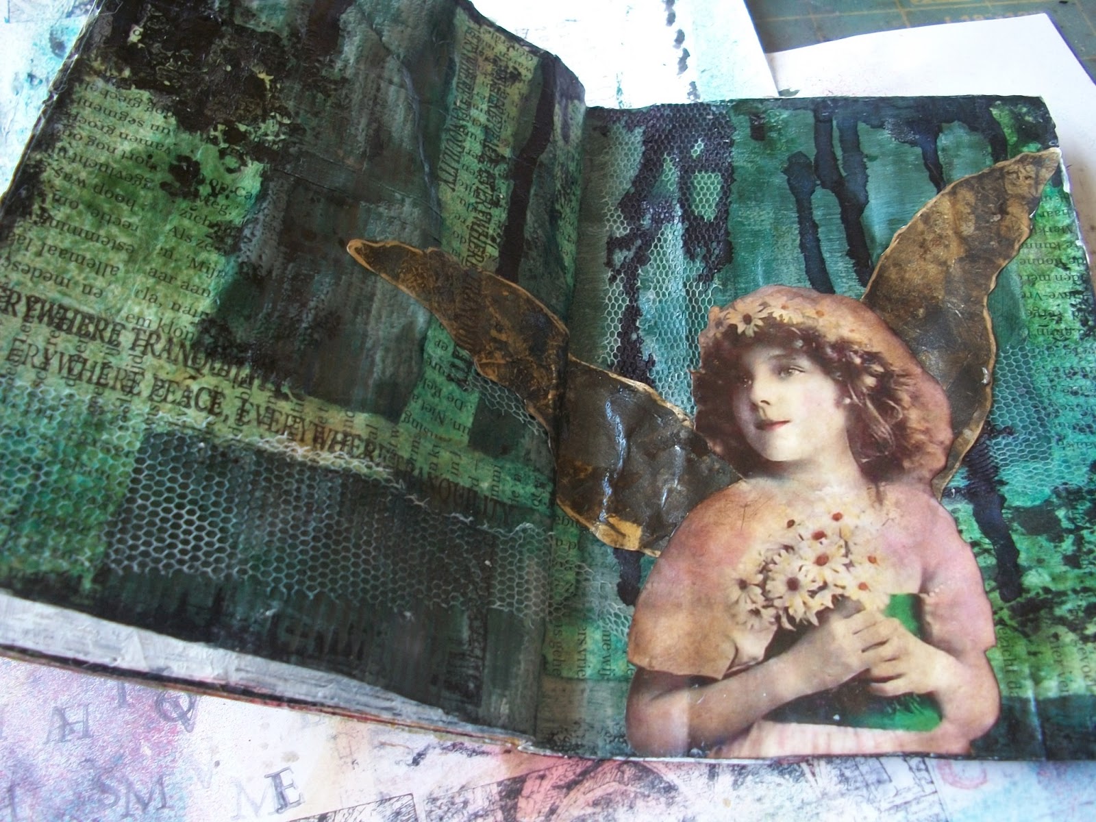 For the next page I explored the layering technique a little more by adding strips of book pages (cut outs from the iPhone case I made), tule fabric, acrylic paints, glimmer mists and alcohol inks. I can’t remember what colours I used. I then added the little fussy cut girl, distressed her with victorian velvet, walnut stain and brushed corduroy. I then gave her wings and added a diamond glaze over the top.