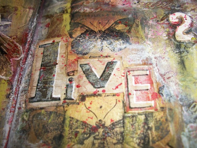 I did like it, but felt it needed a little extra…wich I did…added some red acrylic drip and toned that down with whitewash and rub ‘n buff. Then added the black die cuts to the left.