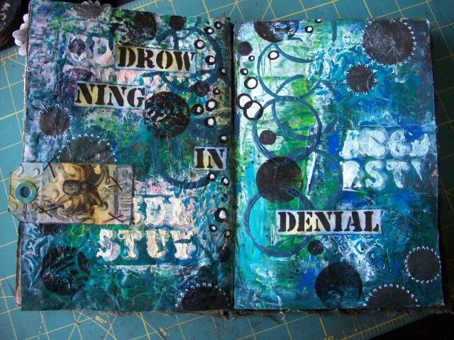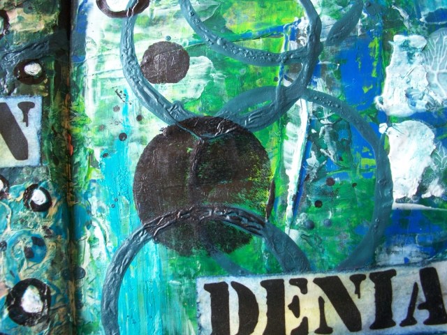 I like the right page best. It is somewhat cleaner, due to the fact that the underground page was smoother before I started. Wich is what happens when you plunk all sorts of pages in your art journal. But, it being a journal for experimenting with materials and techniques, I wasn’t going to let it bother me. I allso found that the underground of the left page did seep through the paint somewhat, so I need to think about sealing methods, especially when working with lighter paints.