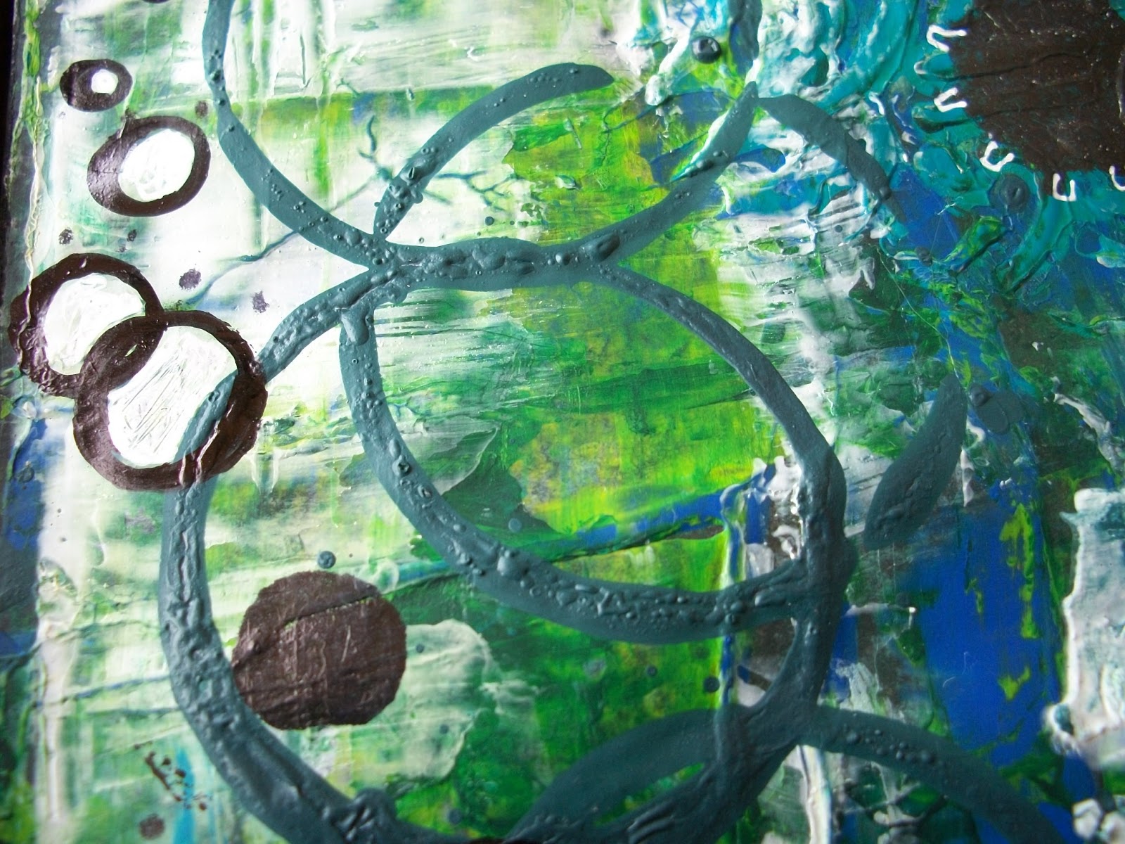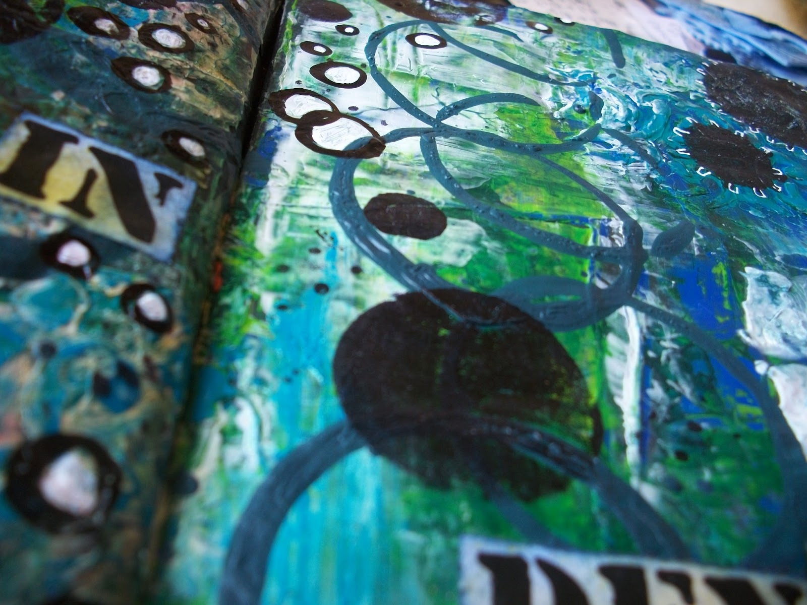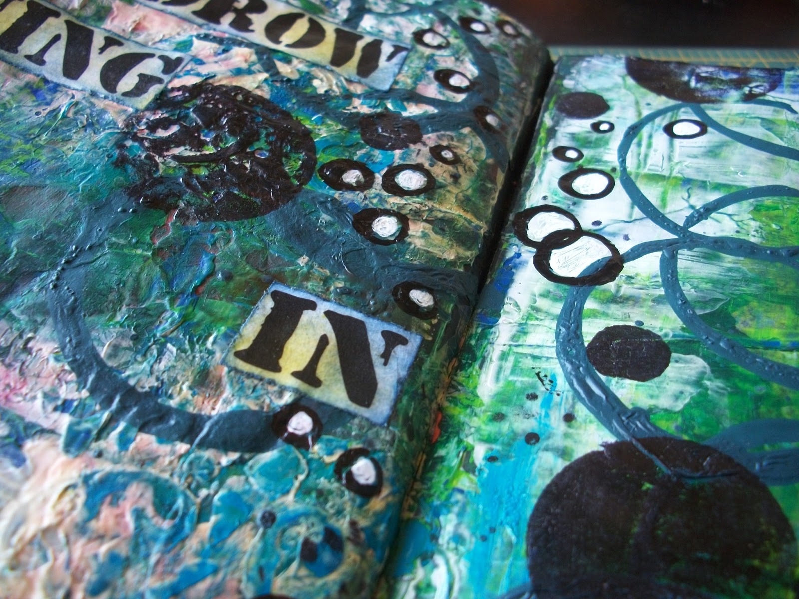 Last night I finished another journal page. For this page I wanted to play a bit with circles and templates. As I am still trying to get to grips with wotking with templates. I had a sea sponge template that came with a set of glimmer mist sprays and I had some templates made by die cutting alphabets and gears. I also used an egg cup (if that is what you call it) and a home made stamp with 2 circles.