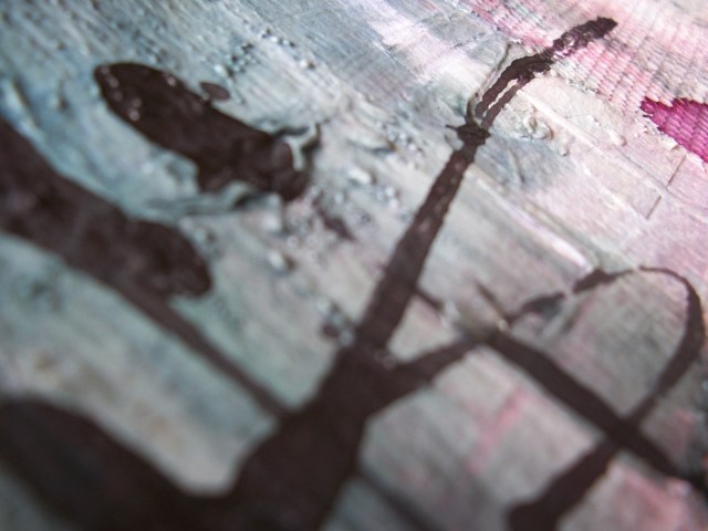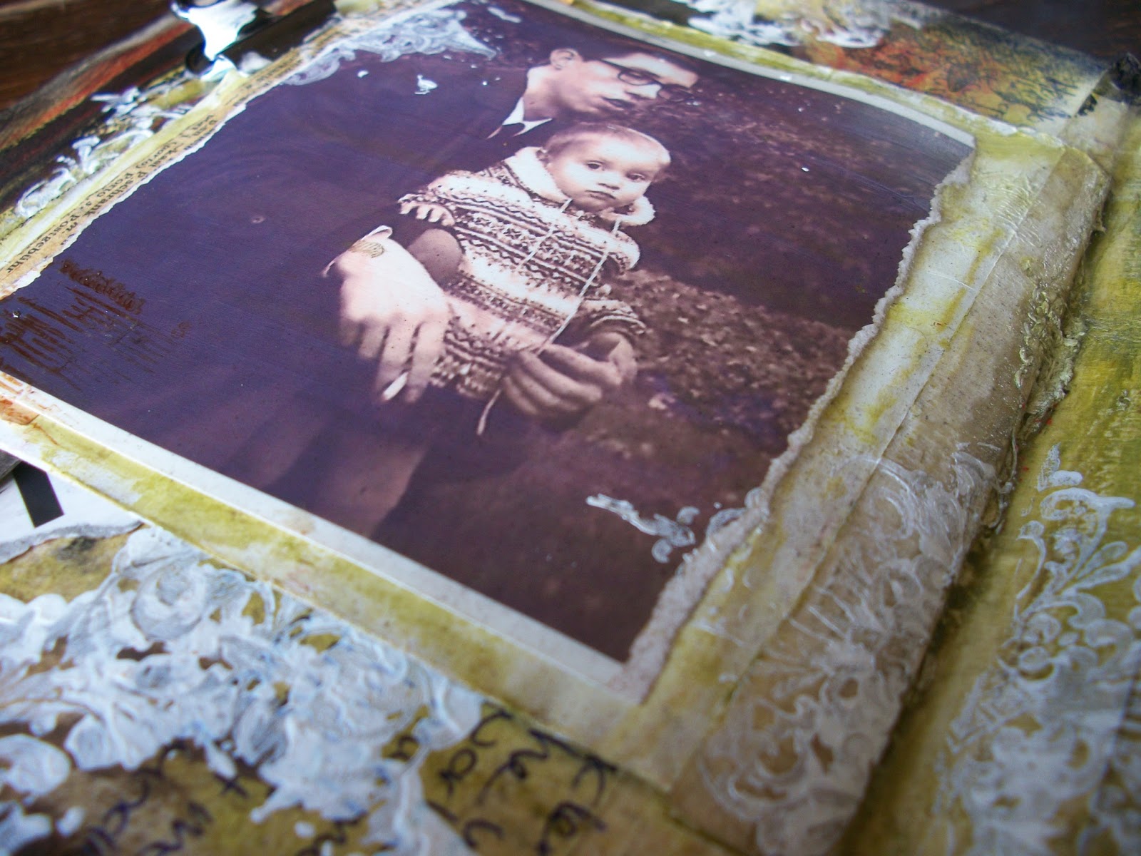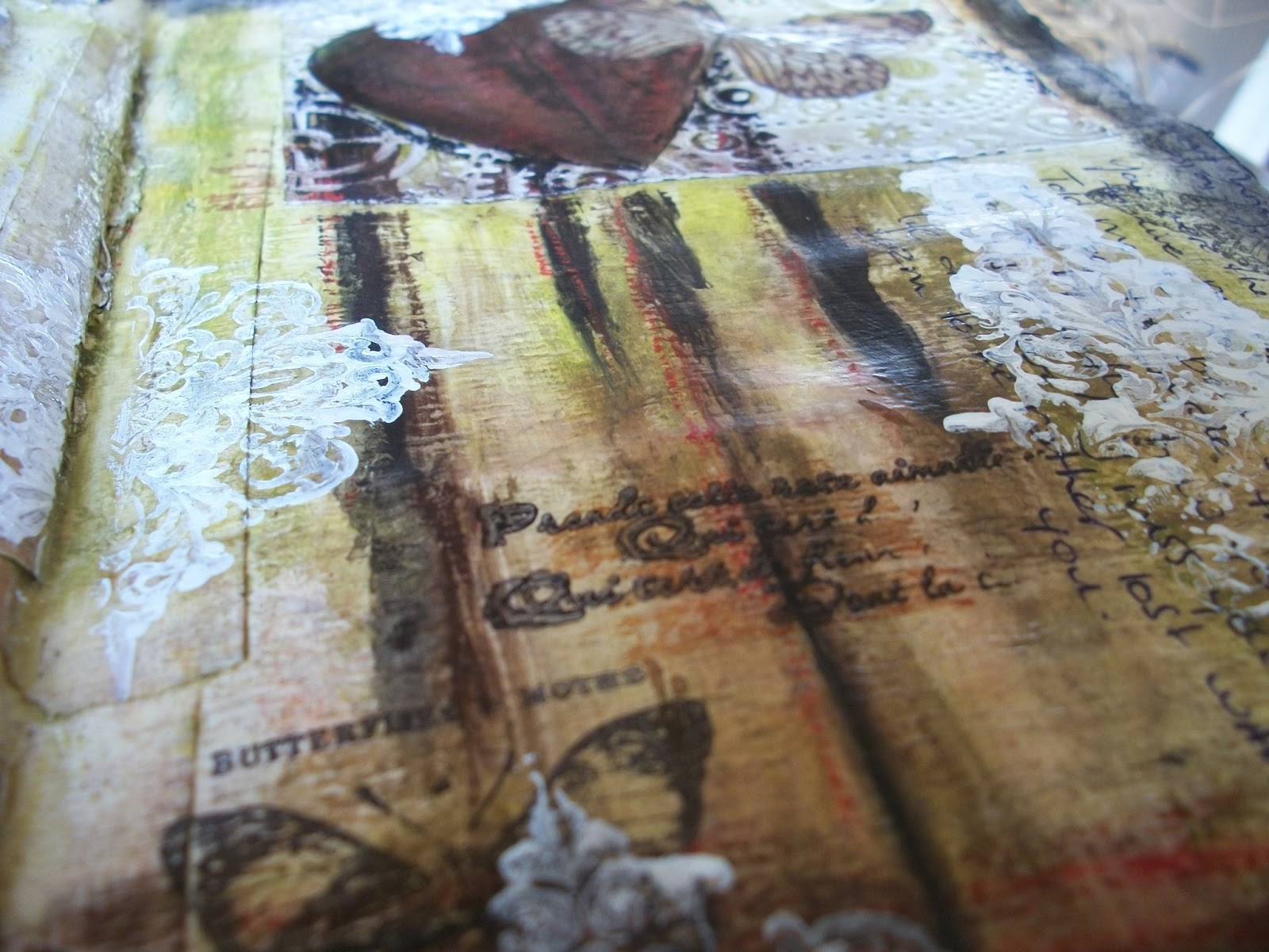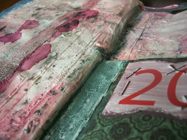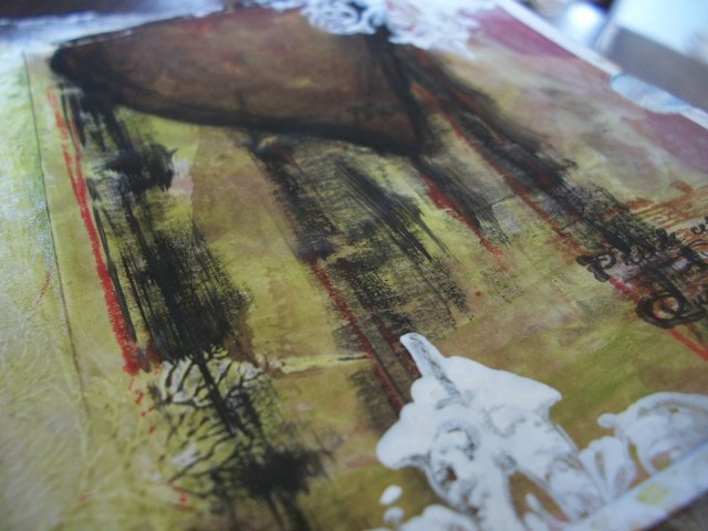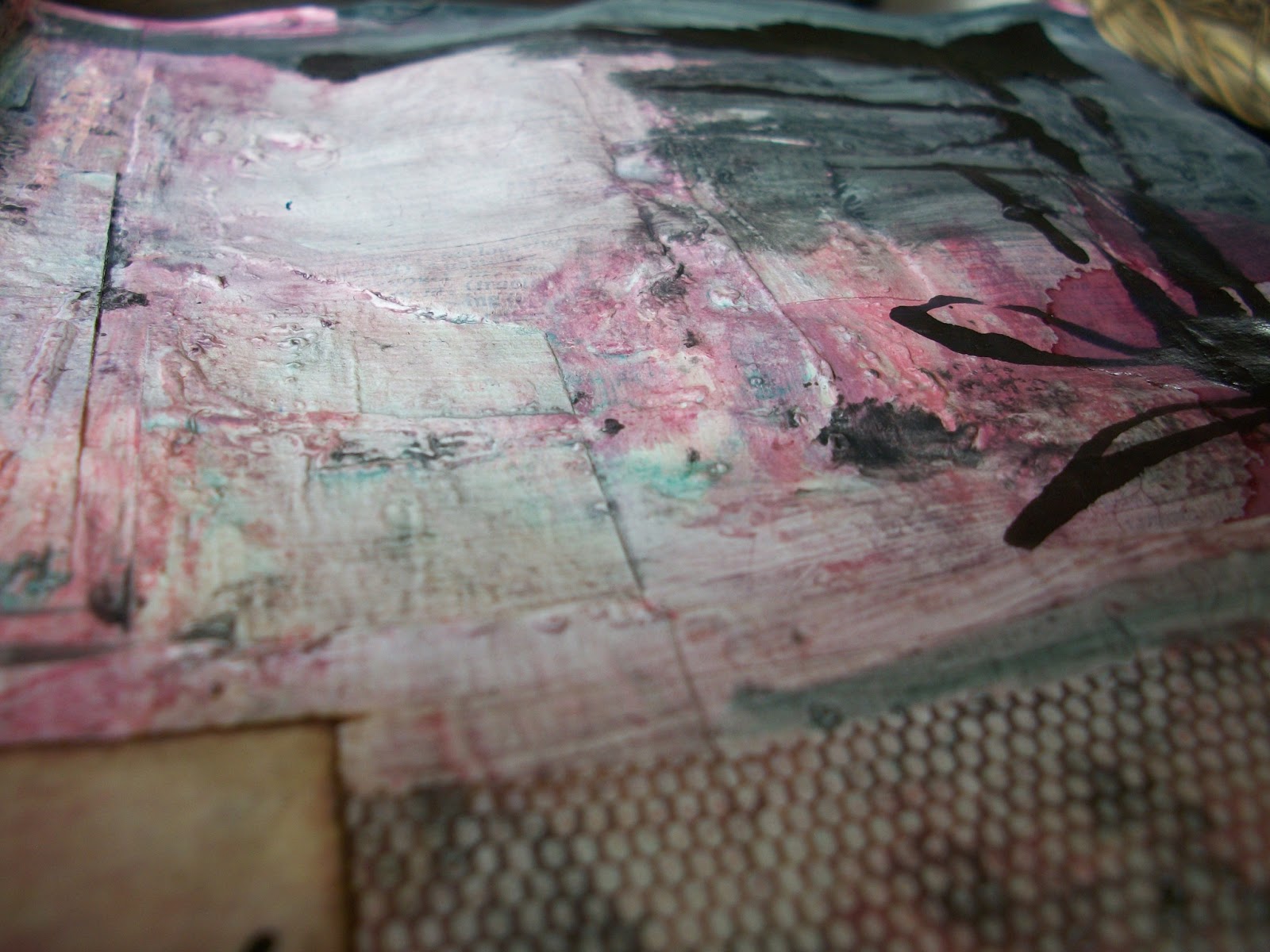 There is lots of texture going on, with tape, tulle, paper and overheated gesso.