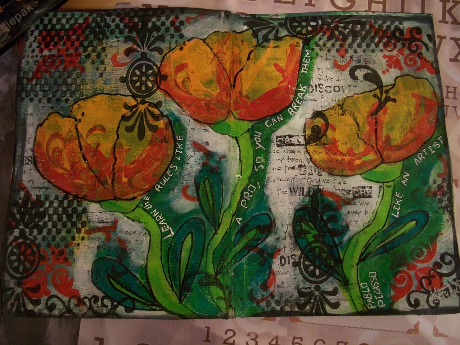 The flowers actually started as a blob of to much yellow paint on the page. I decided to just go with the flow. I kinda like how it turned out. Even with this being way out of my comfort zone.