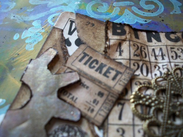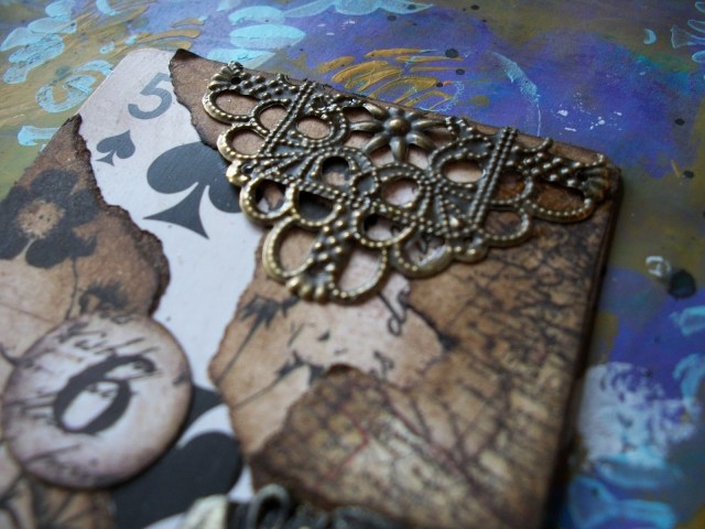 The torn paper works so very well with those metal embellishment and the B&W from the playing cards! Beautiful!