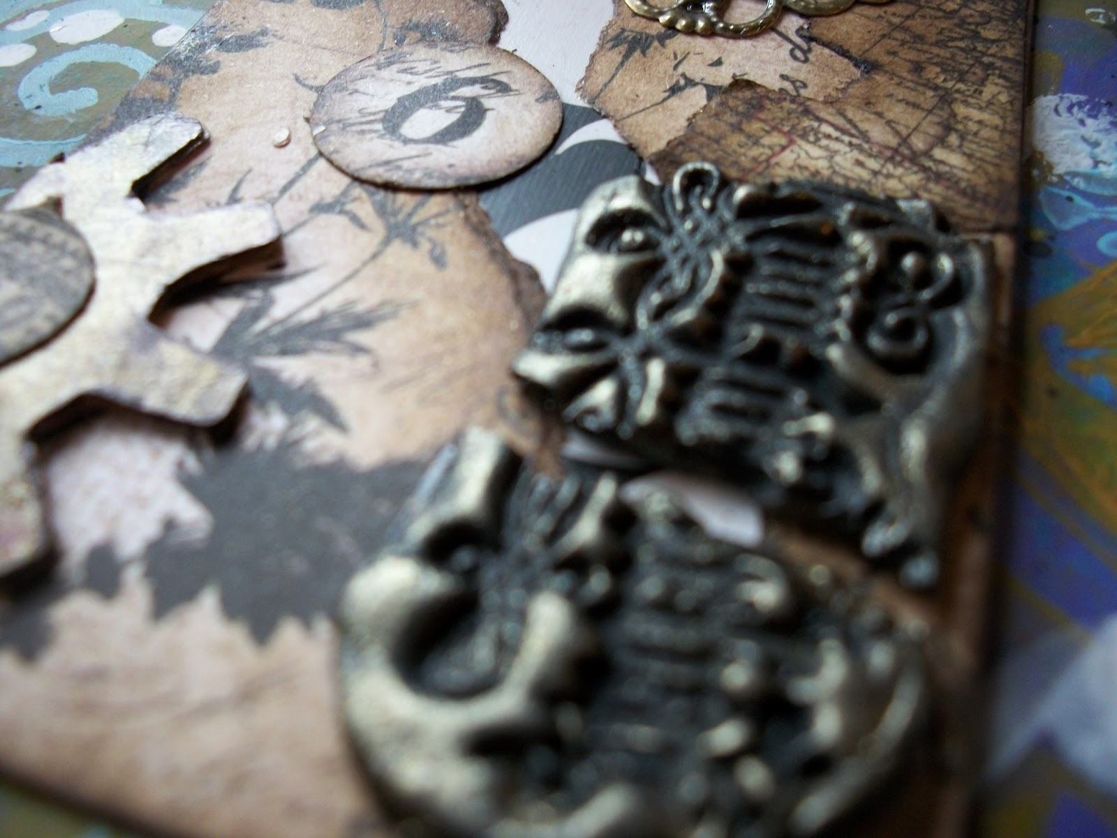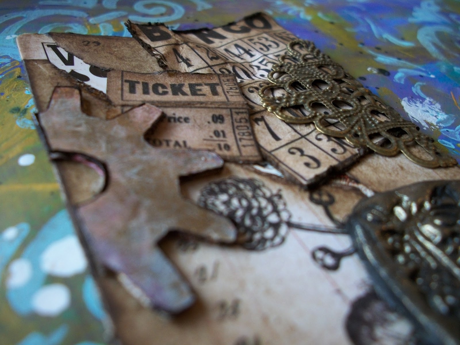 The torn paper works so very well with those metal embellishment and the B&W from the playing cards! Beautiful!