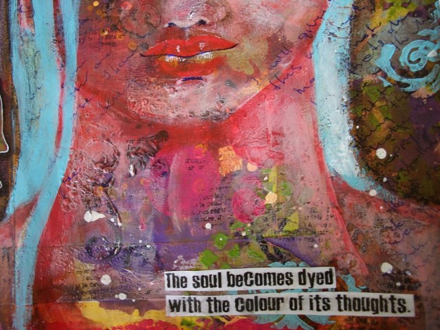 The quote “The soul becomes dyed with the color of it’s thoughts” by Marcus Aurelius has been sitting in my little black book for quite some time now. Today I was looking for something to go with my new art journal page and I came across it again. I felt it was really appropriate for this page with all of it’s colors.