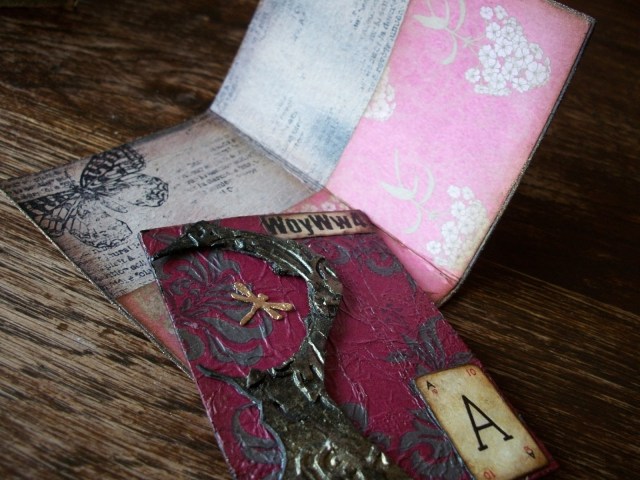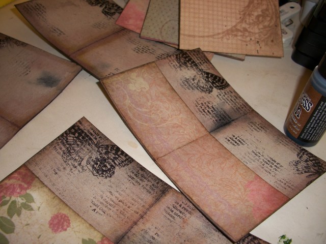 I cut and folded some card board  and scrap papers to make the ATC folders. Distressed and stamped them and glued it all together. That didn’t really wotk the way I wanted to, but I guess good enough for now. Next time I will attach the decorative paper in a different way to avoid warping of the paper when I the folders are closed. I put the whole lot under a stack of books to flatten them.