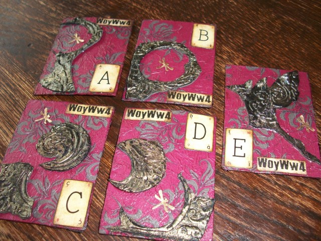 So that’s all of them done. I really like how they came out and I will try the embossing with the plates again. I just have to find the right way to do it, without wrecking my plates or having to pick pieces of paper from the clay…