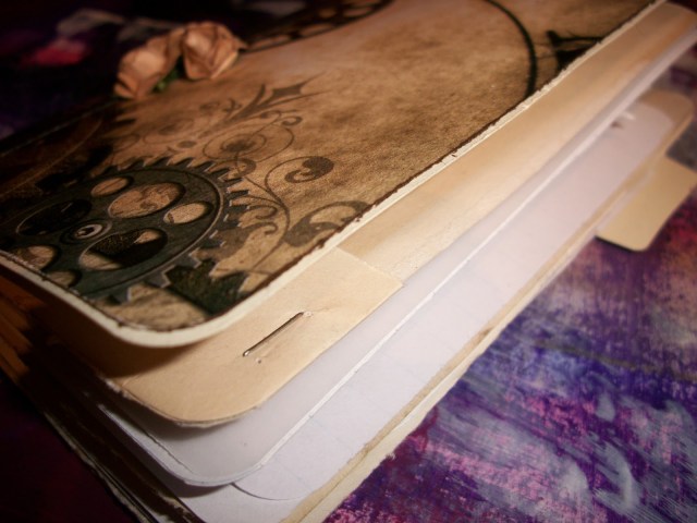 Then I saw some realy cute file folder mini booklets made with a mini file folder and just some random papers in them. I fell completely in love with these. You can see some great examples at RoxPaperScissors and Yolanda’s Crafty Channel on Youtube.