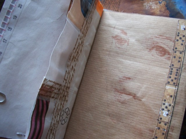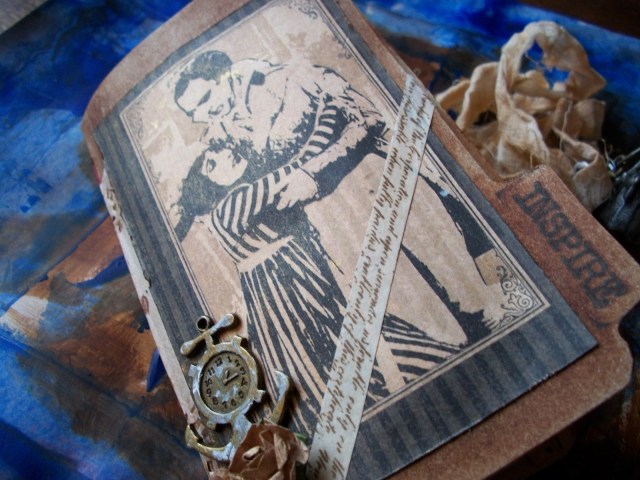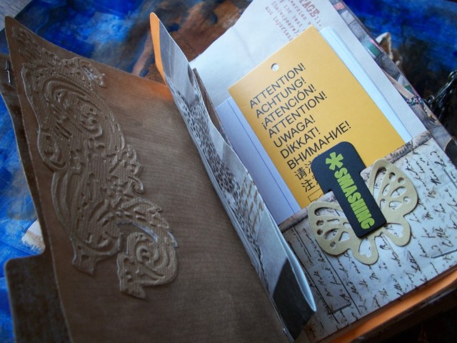 Stuck some embossed embellishment, made from Tim Holtz Kraft core paper, from my scrap pile onto a page made from a kraft bag, a cute little clip and some papers in the pocket.