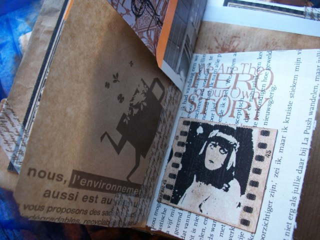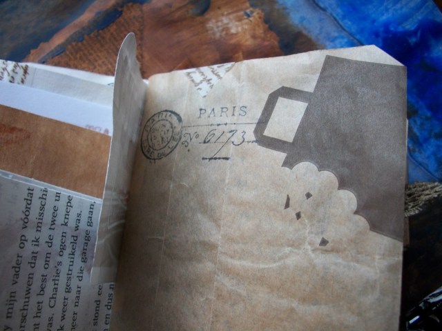 This journal has been made with a huge junk mail envelope, some kraft paper bags from when I was in Paris, Β scrap papers with a movie theme (can’t remember the paper line) and cardstock. I added an Eifel tower keychain embellishment, bought when I was in Paris and several other things. I will add some more bits and bobs that might be nice for the crafty winner of the birthday giveaway.