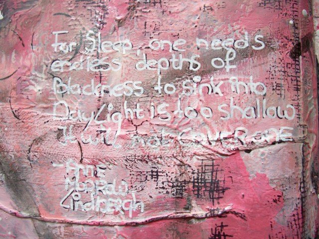 The quote is by Anne Morrow Lindbergh and it reads: “For sleep, one needs endless depths of darkness to sink into. Daylight is too shallow, it will not cover one.”