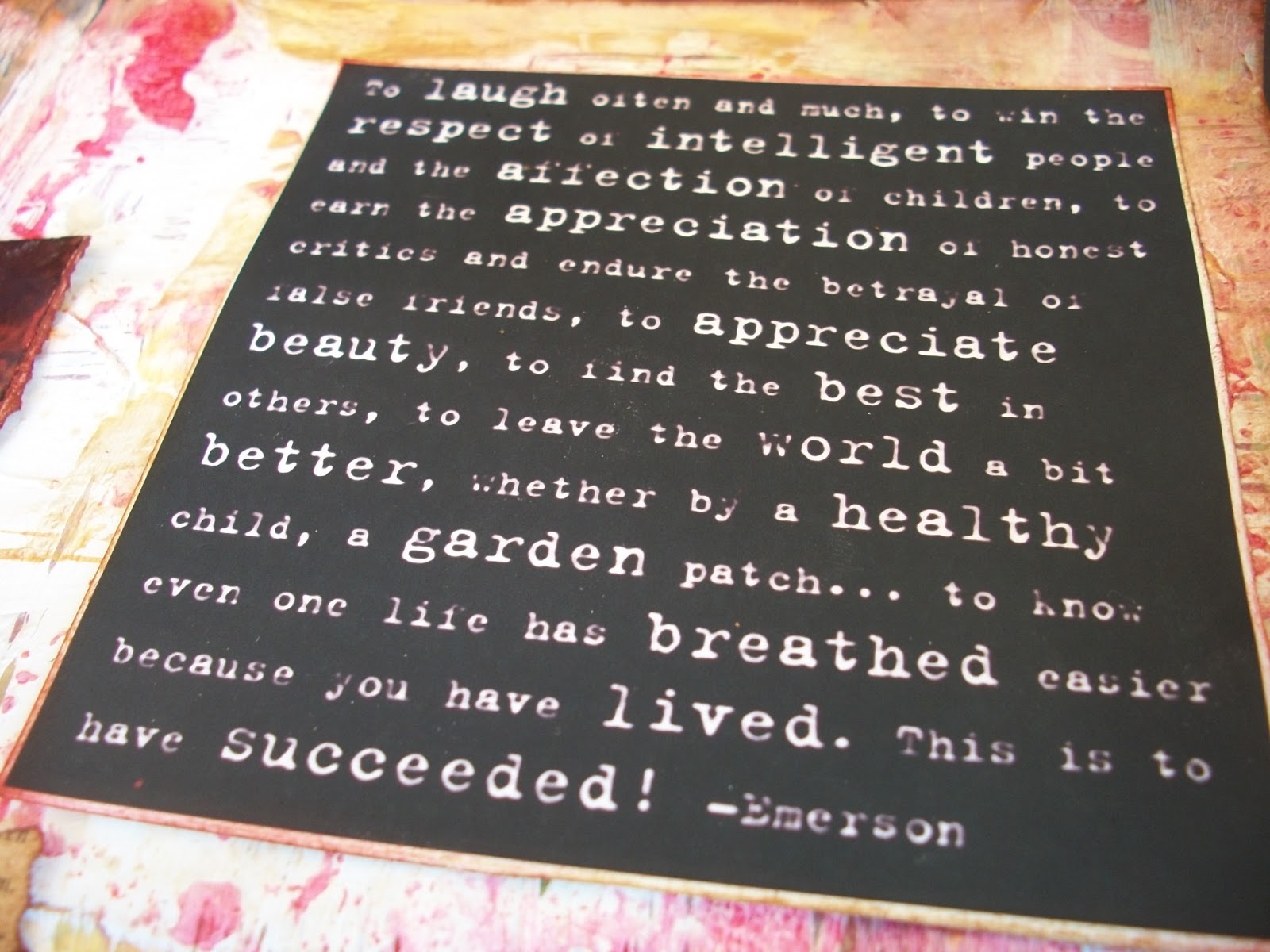 To laugh often and much; to win the respect of intelligent people and the affection of children; to earn the appreciation of honest critics and endure the betrayal of false friends; to appreciate beauty; to find the best in others; to leave the world a bit better, whether by a healthy child, a garden patch or a redeemed social condition; to know even one life has breathed easier because you have lived. This is to have succeeded.