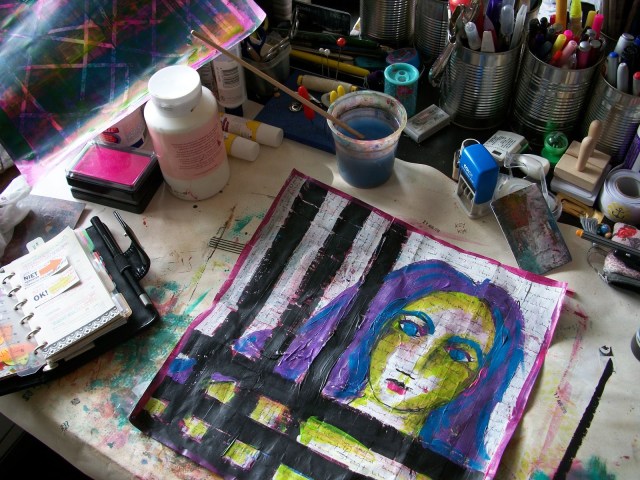 On my desk you can see one of those art journal paintings. I do consider them art journal pages, because I do journal on them. That is, I dump the contents of my brain into my arm and out through my fingers onto the paper. I don’t stop to think and just let it all out. The same way I write in my day book.