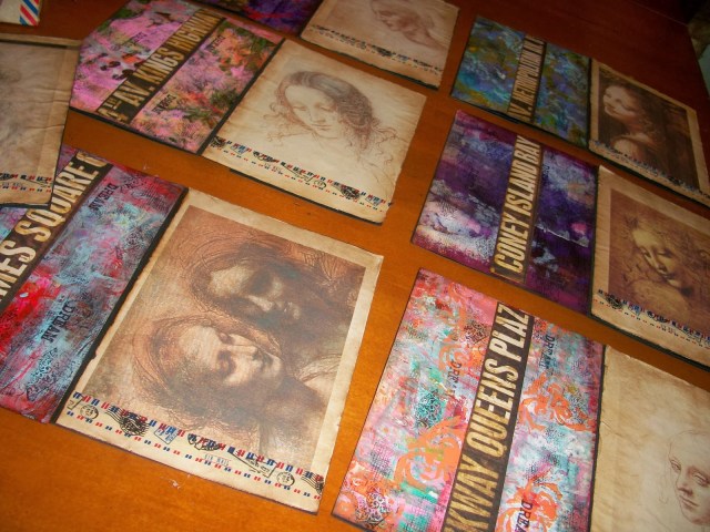 I made the signatures by folding and glueing some black papers I had in to 2 spreads per signature, with pockets and then gathered some painted papers. Cut some strips from a sheet of 8-8″ paper and printed these Da Vinci ladies, to represent each participant.