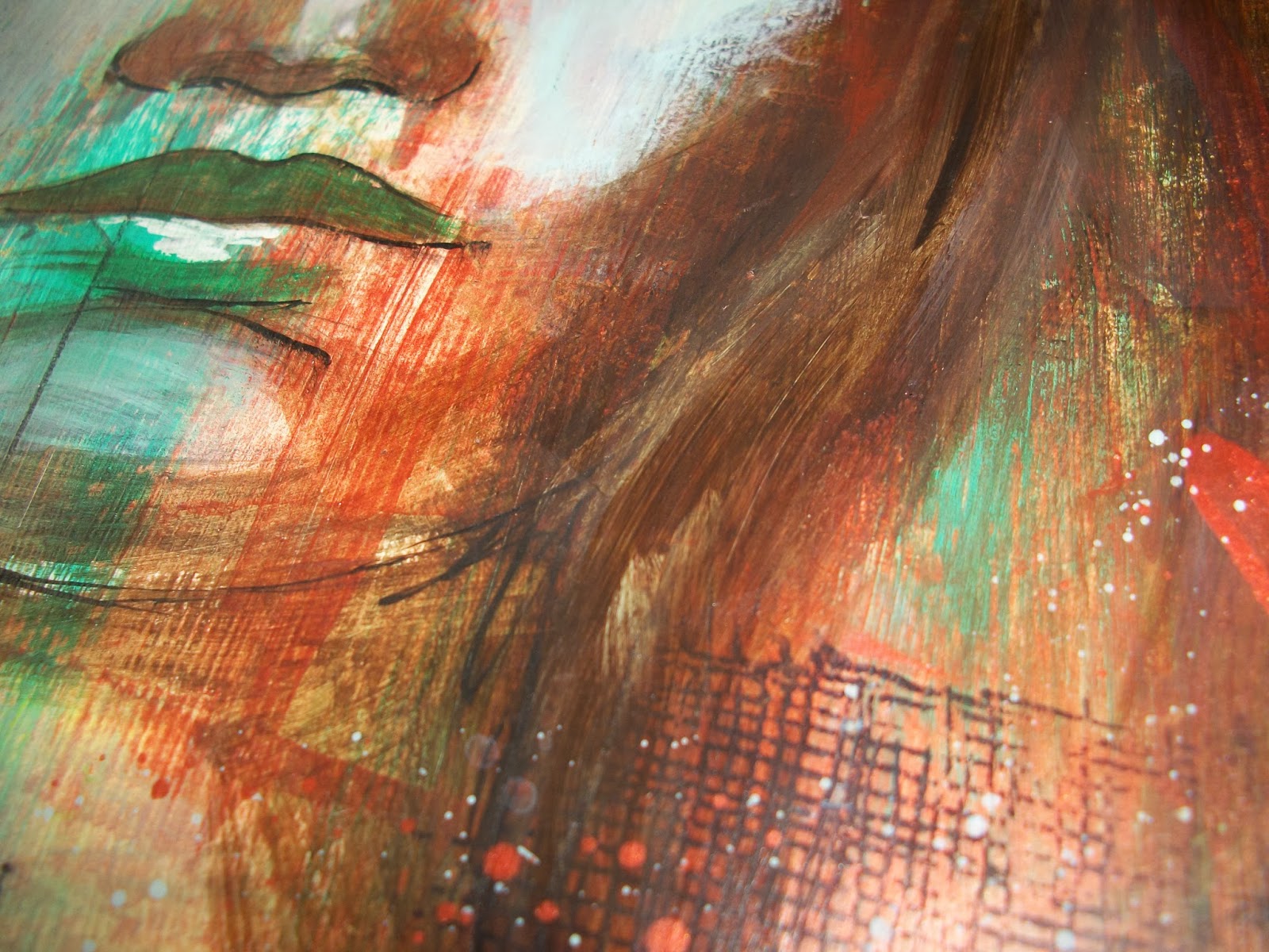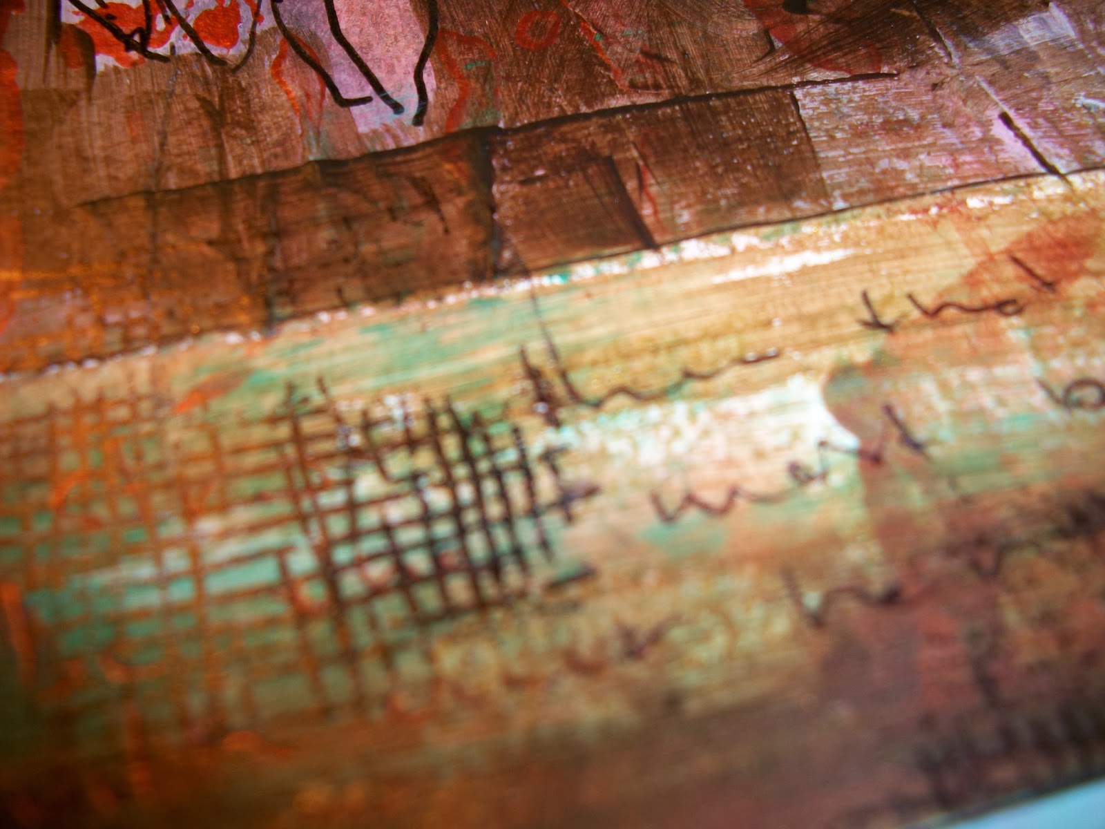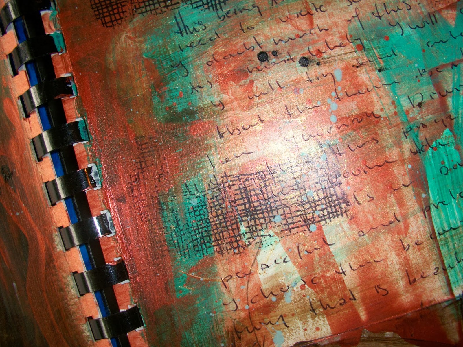 I then added some copper, turkuois and gold paint on top. The gold I added through a stencil.