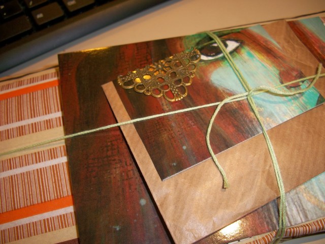 I also made a plain third lined insert, but I have no pictures of that one. I wrapped it all up with one of my new post and business cards. I used one of the pictures of a page I made for the Round Robin Journal swap for these cards.