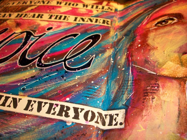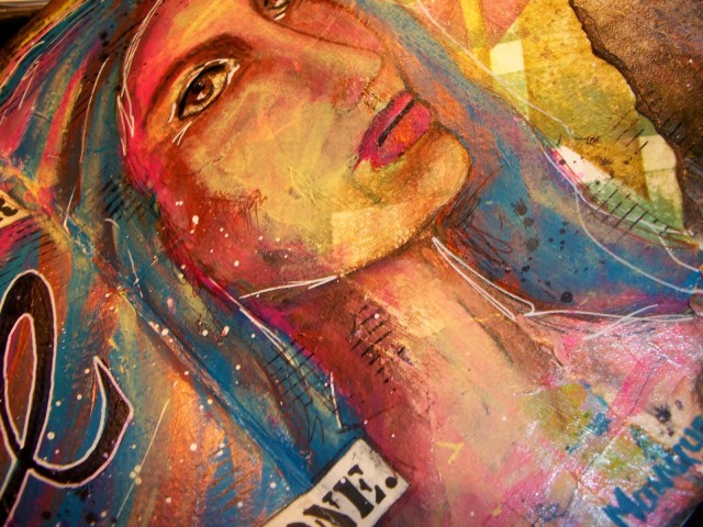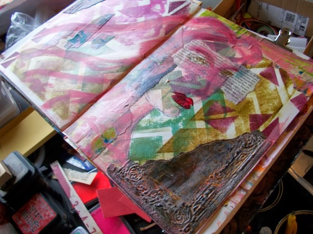 I collaged some painted papers to the pages and a piece of booktext with eyes stamped on.