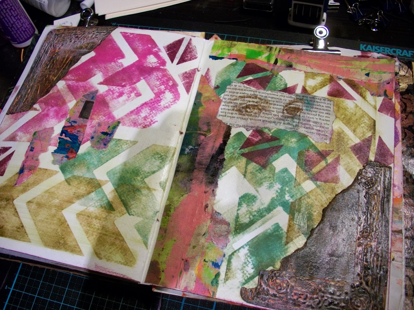 I collaged some painted papers to the pages and a piece of booktext with eyes stamped on.