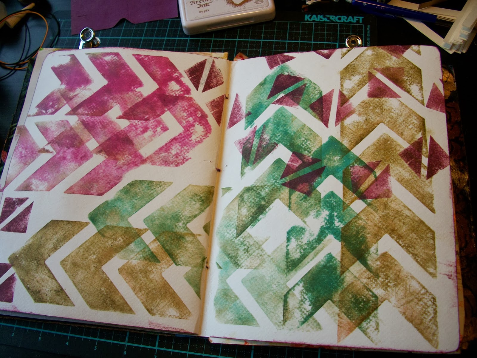 I had no clue as to what I would do with this, but just started doing something. I made a chevron fun foam stamp and felt it was appropriate to play with it in her journal. They sort of remind me of tire tracks…so that would be the outer taken care of.