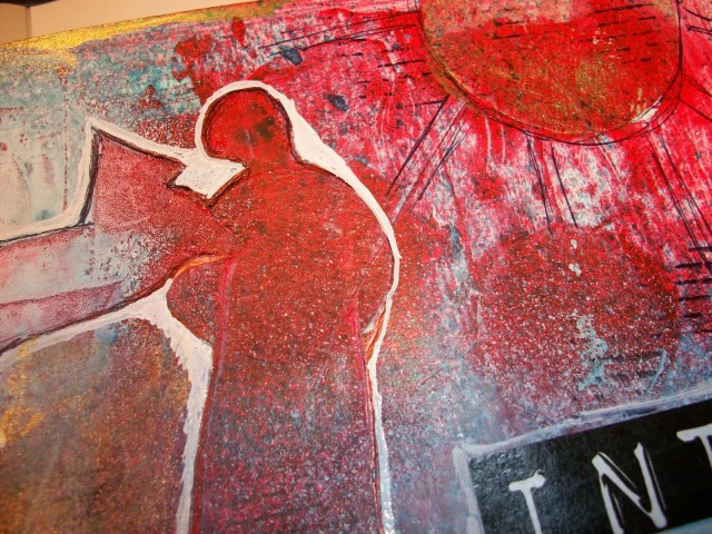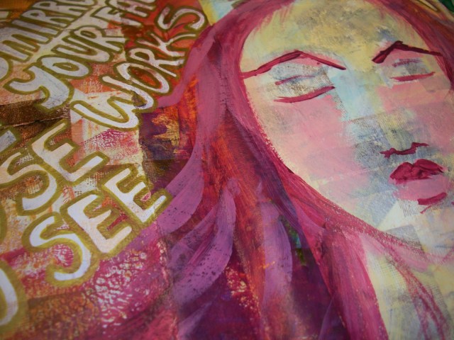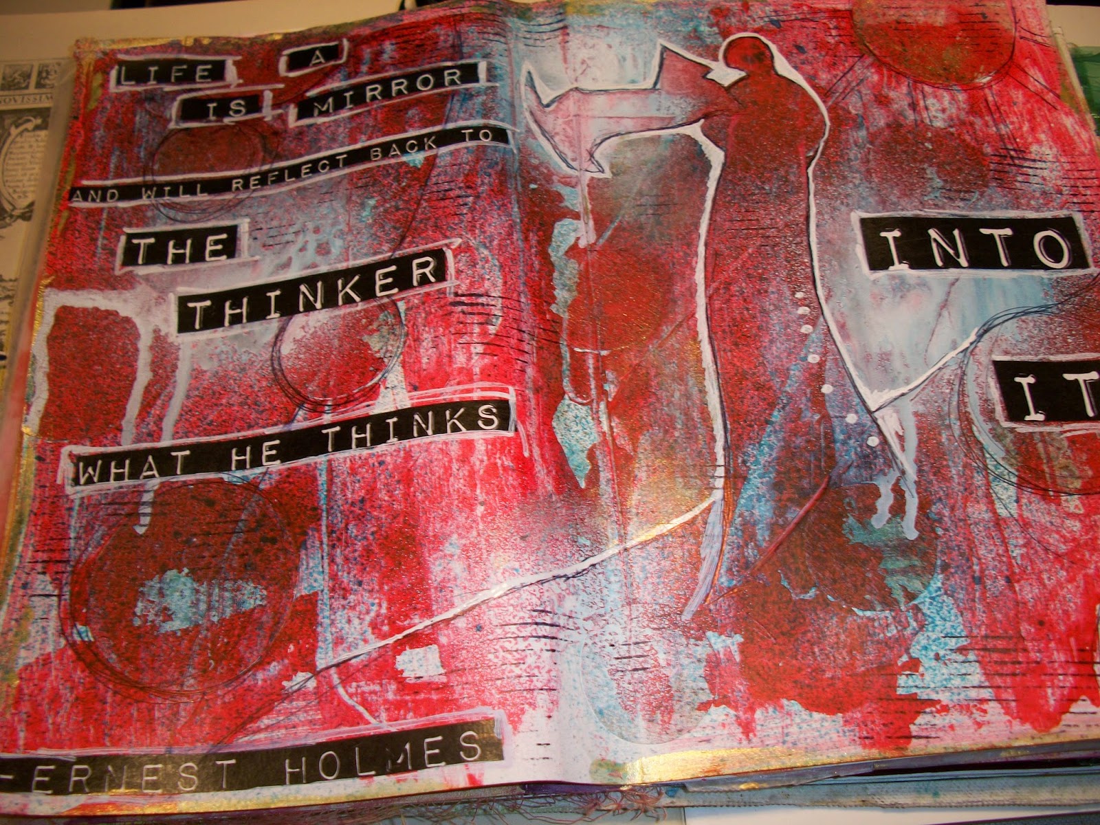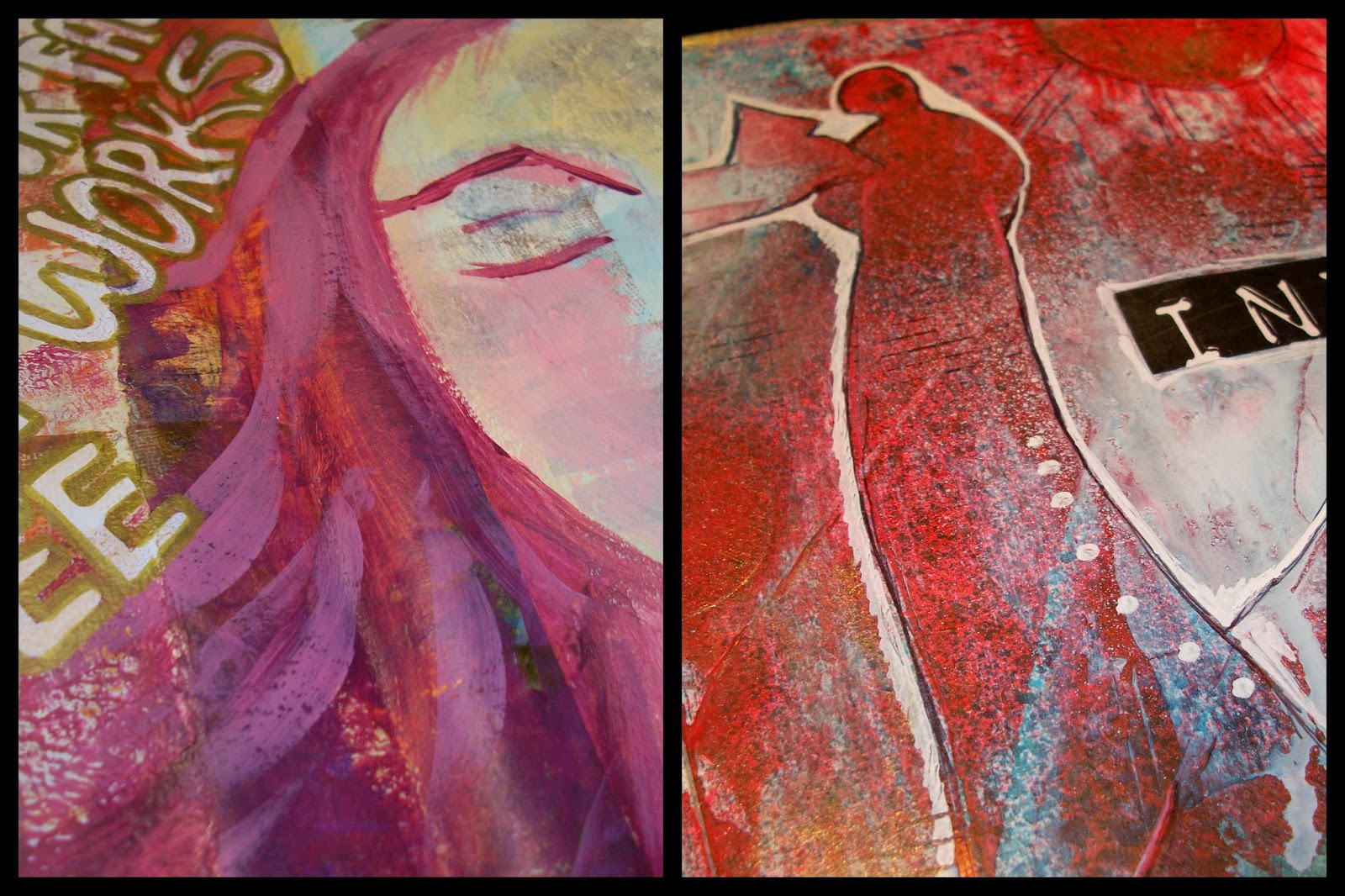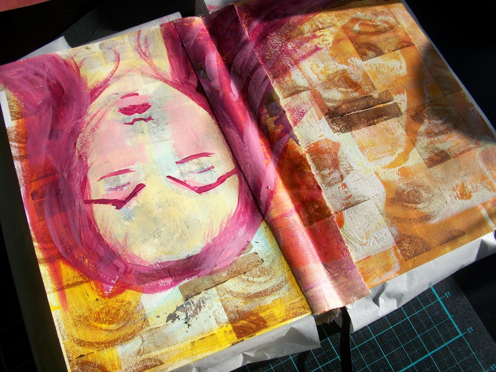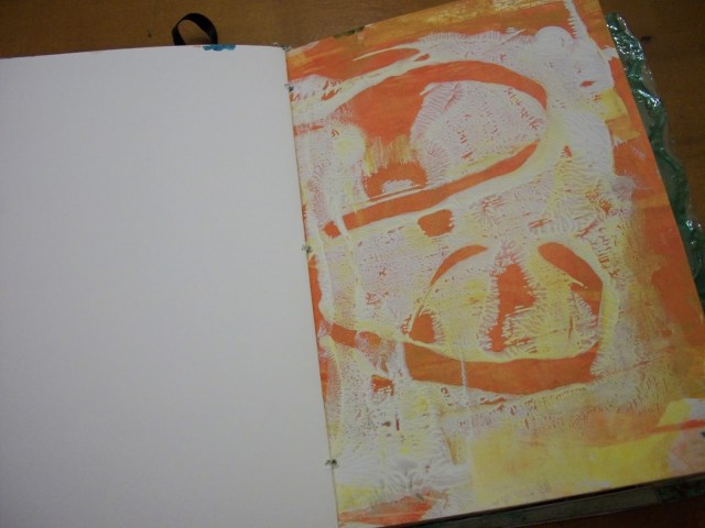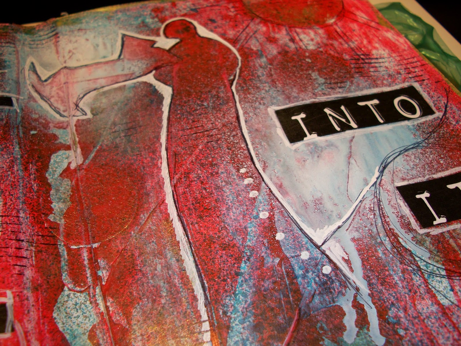 I wanted the next spread to be completely different, so I picked a white page and started with Gesso on the white, unpainted, background.