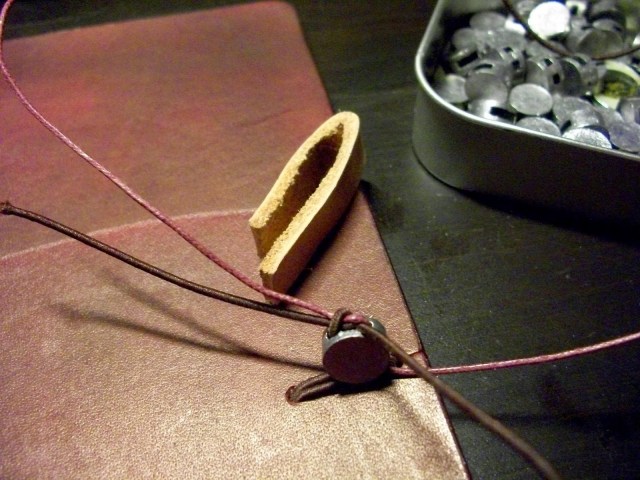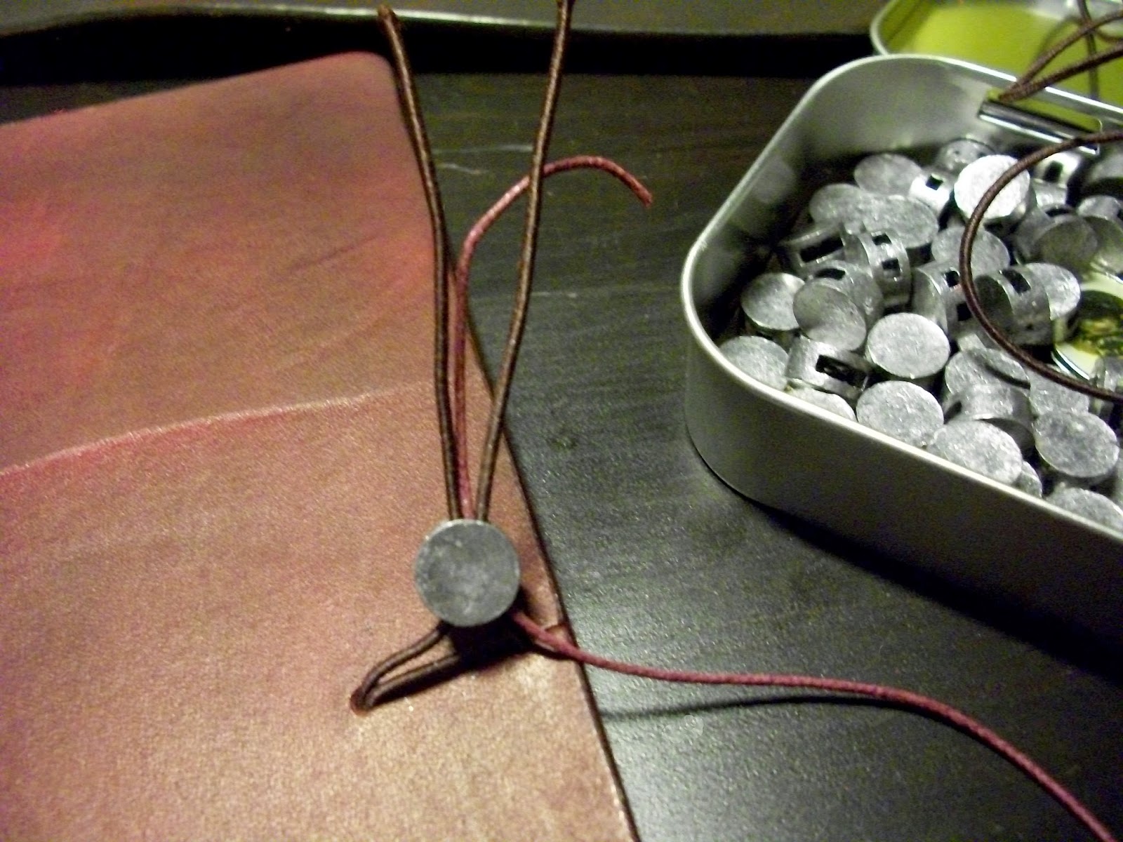 In case you don’t use the tin clasp, you can just pull the top elastic to the inside and the bottom one as well. You can then tie a knot in them on the inside and be done. You’ll also have to tie your waxed cord for the bookmark to one of the elastics.