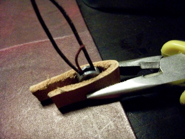 I use a little scrap piece of leather to keep the clasp from getting scarred by the pliers. You don’t need to do that, I just prefer it this way. It not only protects the clasp, but also the leather from getting scratched by the tools. Which is another reason why I prefer not to use a hammer.
