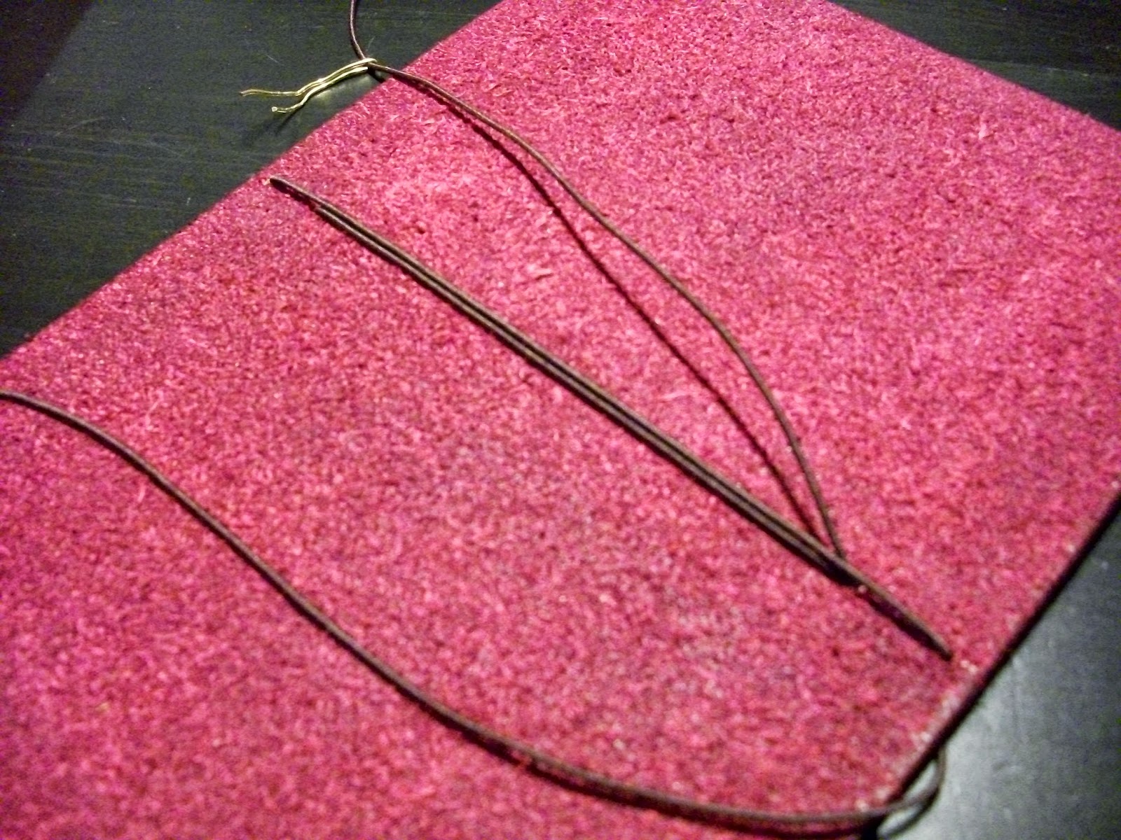 Take the waxed cord and pull through the hole next to the top elastic, using the same folded wire (or anything else that’s strong enough)