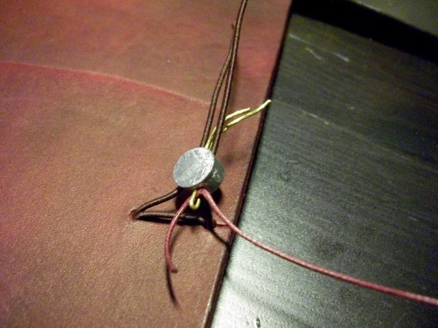 I also like to use the little tin clasp, since it performs two functions. It not only keeps the elastic for the spine, but it also holds the bookmark, keeping the amount of knots needed to attach everything to a minimum.