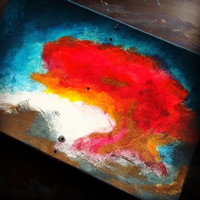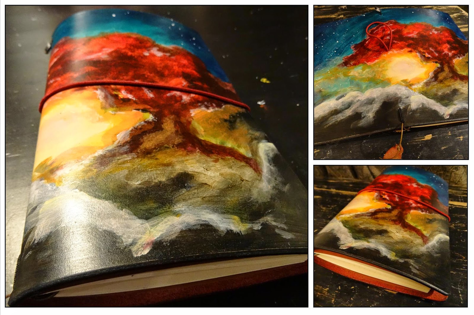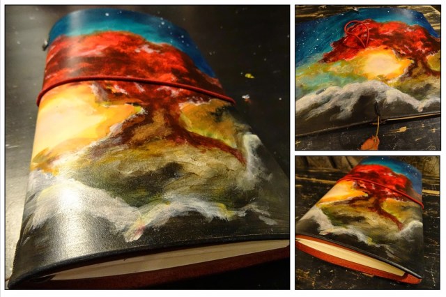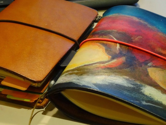 Á while back I discovered you can paint Leather Travelers Notebooks with acrylic paint, my all time favorite medium. Regular Acrylic paint will work, however special acrylics for leather are better and give a much nicer result.