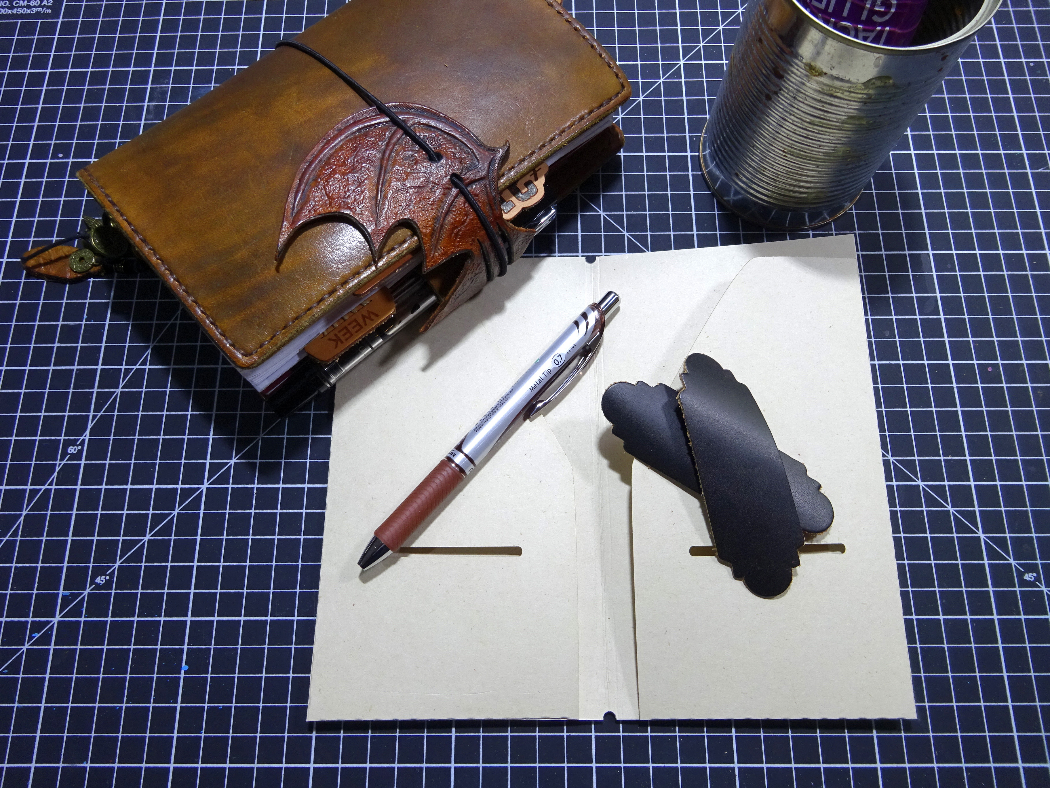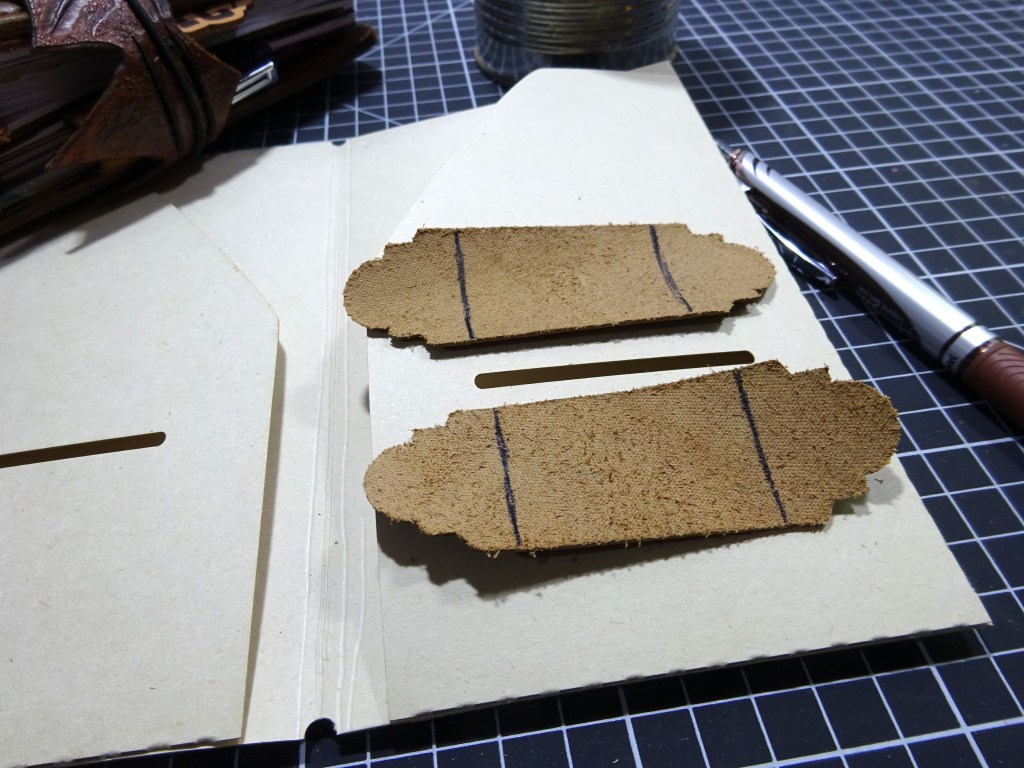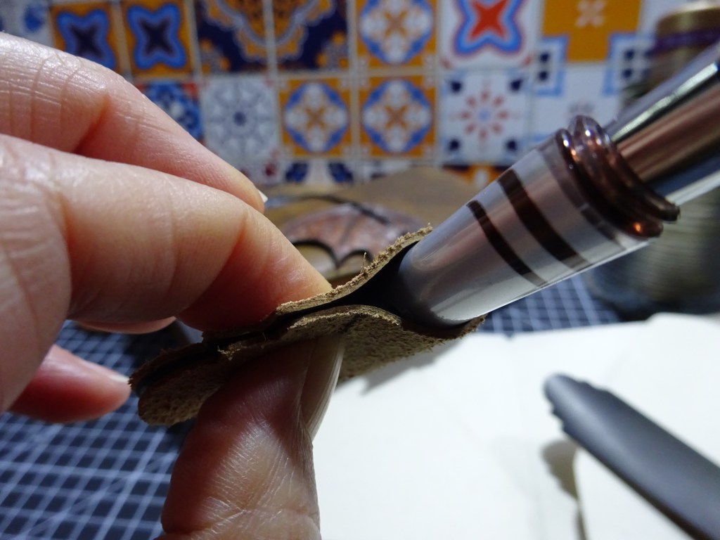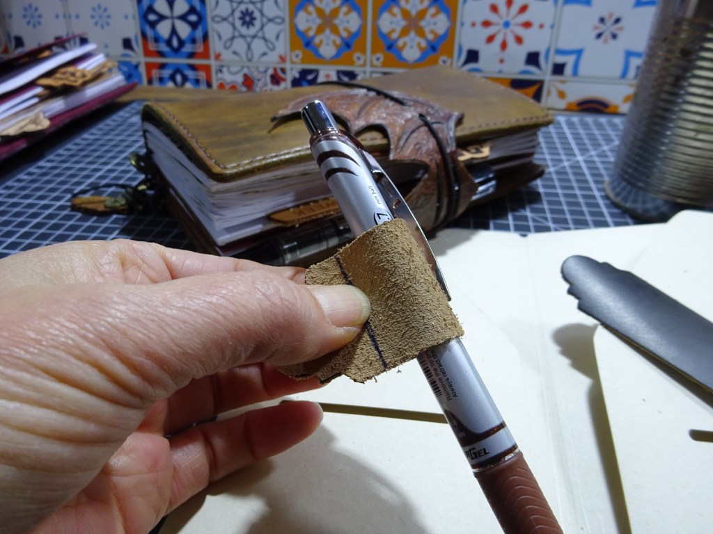 Once you have the leather (or other material you prefer) to use for the pen-loop, you can measure the width of the pen you want to use. Fold the leather around your pen with the inside facing out and pinch it closed. Leaving enough room for the pen to slide in and out easily, but not fall out randomly. Mark this where you pinched it.