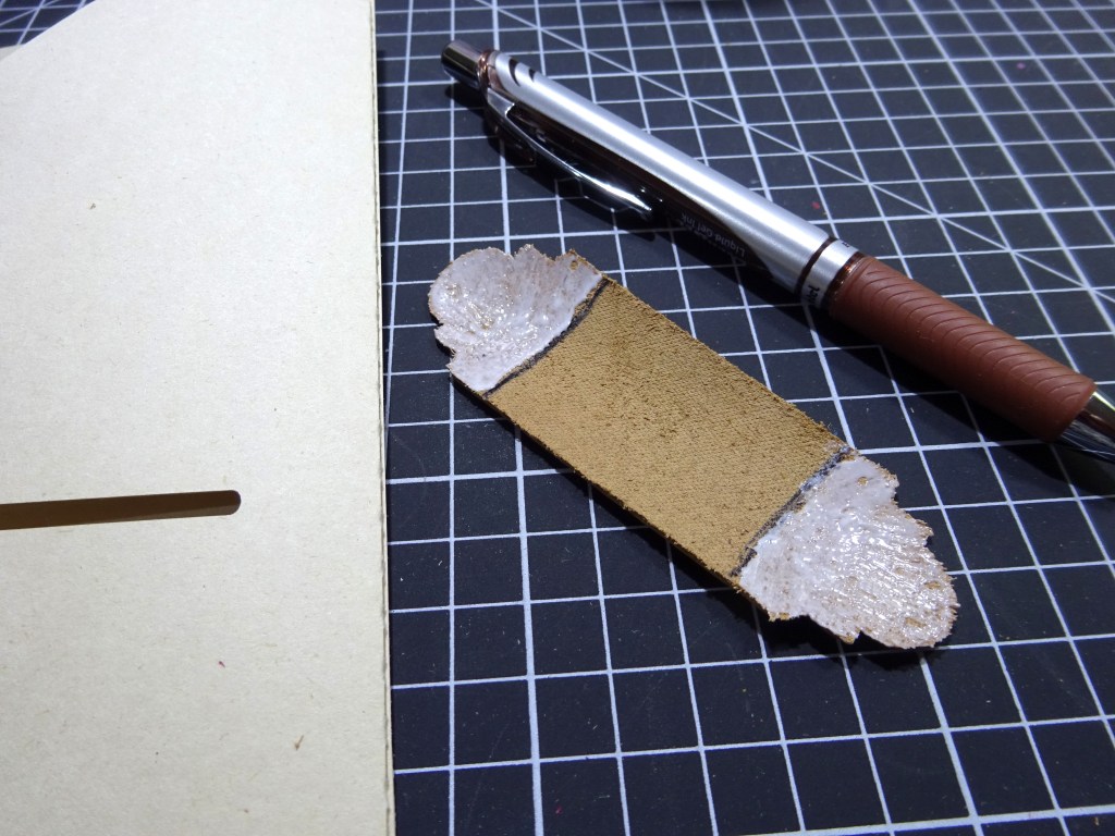 You will need a piece of leather long enough to wrap around your pen and about 2-3 cm on either side extra to glue it to your folder or insert. Something to measure (I usually use the cutting mat), a pen to measure around and one to mark the leather, and glue. I prefer Aleene’s Tacky glue, but any PVA glue will do. We need the glue to be flexible. I use the Tacky glue, because it’ll stick faster and won’t have to dry that long.